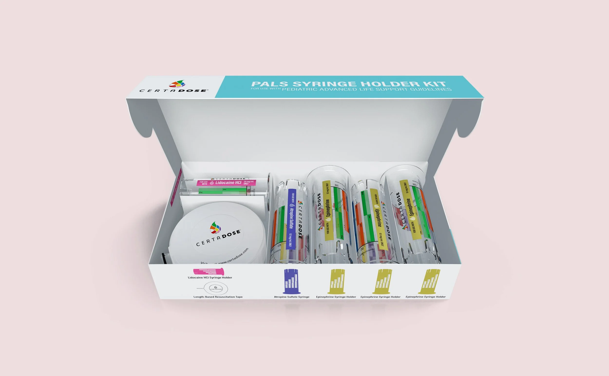 Packaging design, syringe label design, marketing, web design, and branding materials created for the pediatric medical company.